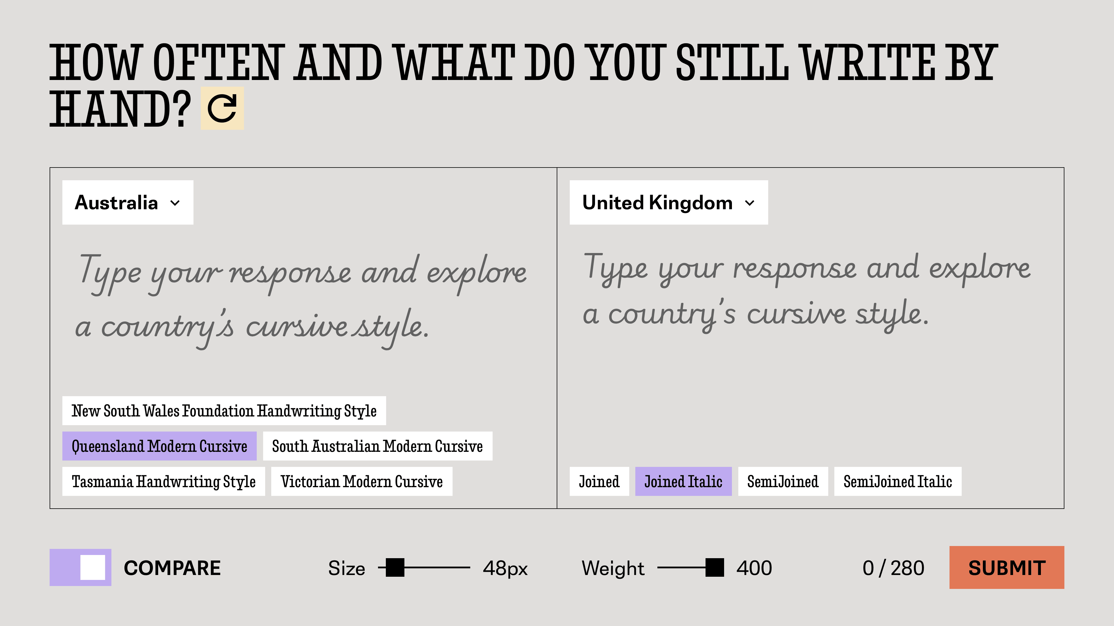 When the "compare" button toggled, the input area will be split into two areas where the audience can start to compare the cursive writing style between two regions.
